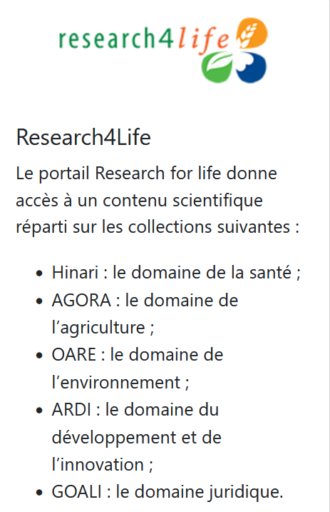 | Research4Life | Le portail Research for life donne accès à un contenu scientifique réparti sur les 5 collections Plus de 60 sources de référence, Plus de 30 bases de données et Plus de 20 collections spécialisées sont accèssibles.https://login.research4life.org/tacsgr1portal_research4life_org/ |
